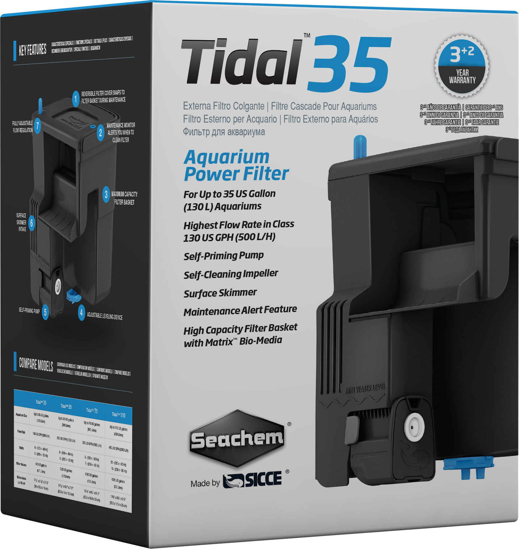 Tidal™ Power Filters are designed from the ground up to provide your aquarium with high-quality, comprehensive filtration. They are easy to use and adaptable to a variety of aquarium conditions. With a host of features including a self-priming pump, dual water intake with surface skimmer, adjustable flow, maintenance monitor, self-cleaning impeller, and a filter basket that holds any kind of filtration media - and more of it - Tidal™ Power Filters are designed to deliver the highest water quality possible with maximum versatility and ease of use.