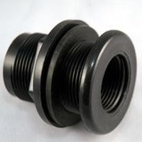 This .75 inch bulkhead features a THREAD x THREAD connection. The rubber bushing always goes on the "wet" side of the tank or reservoir for a proper seal. Threaded pipes or fittings require Teflon tape in between the joint to ensure a water tight seal.