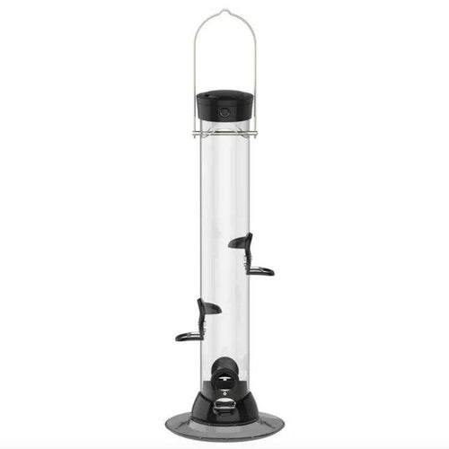 The ultimate in elegance and innovation, these removable base bird feeders come apart and reassemble in seconds for the speediest clean ever. Convenient one-touch opening allows the feeder to be filled with one hand, even when hanging.The seed tray and comfort perches attract a greater variety of birds. The cap, base and ports are powder-coated in a striking black. The UV-stabilized polycarbonate tube keeps seed levels visible and is reliably durable. The internal seed baffle design directs seed to the ports so that the feeder empties completely.