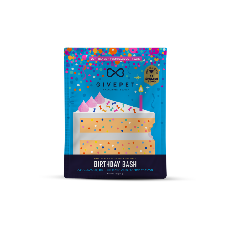 6oz bag of birthday-themed soft baked treats. Made with nutrient-rich whole foods and superfoods. Applesauce, rolled oats and honey flavor! A great birthday gift for your pup!Whether they've found their forever home or not, every dog deserves to feel special. That's why, when you buy a bag of our premium treats, we donate the same goodness to shelters near you.
