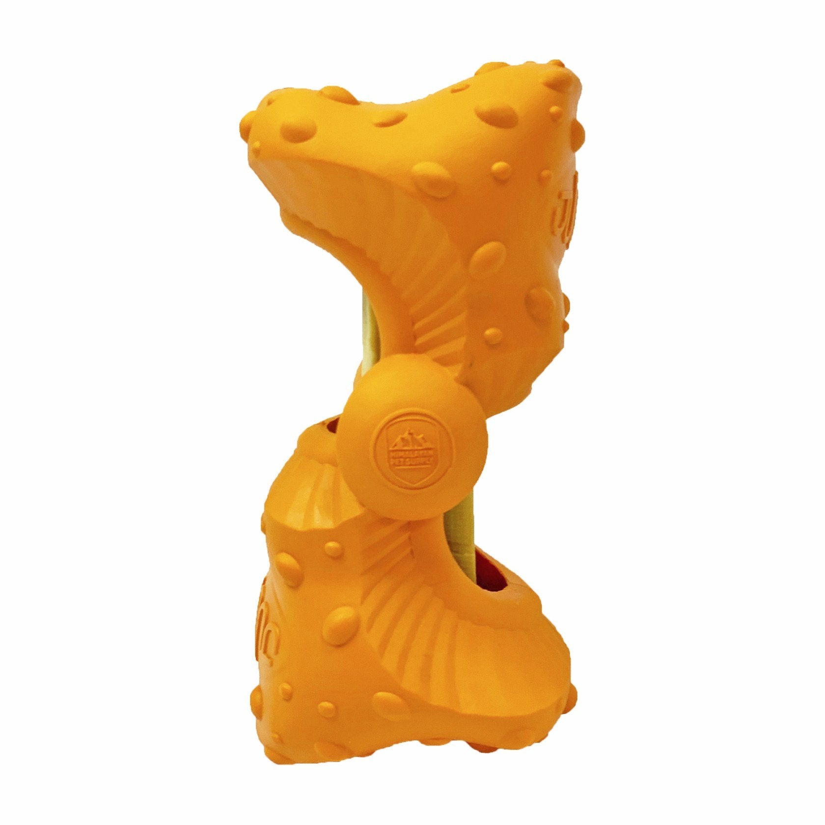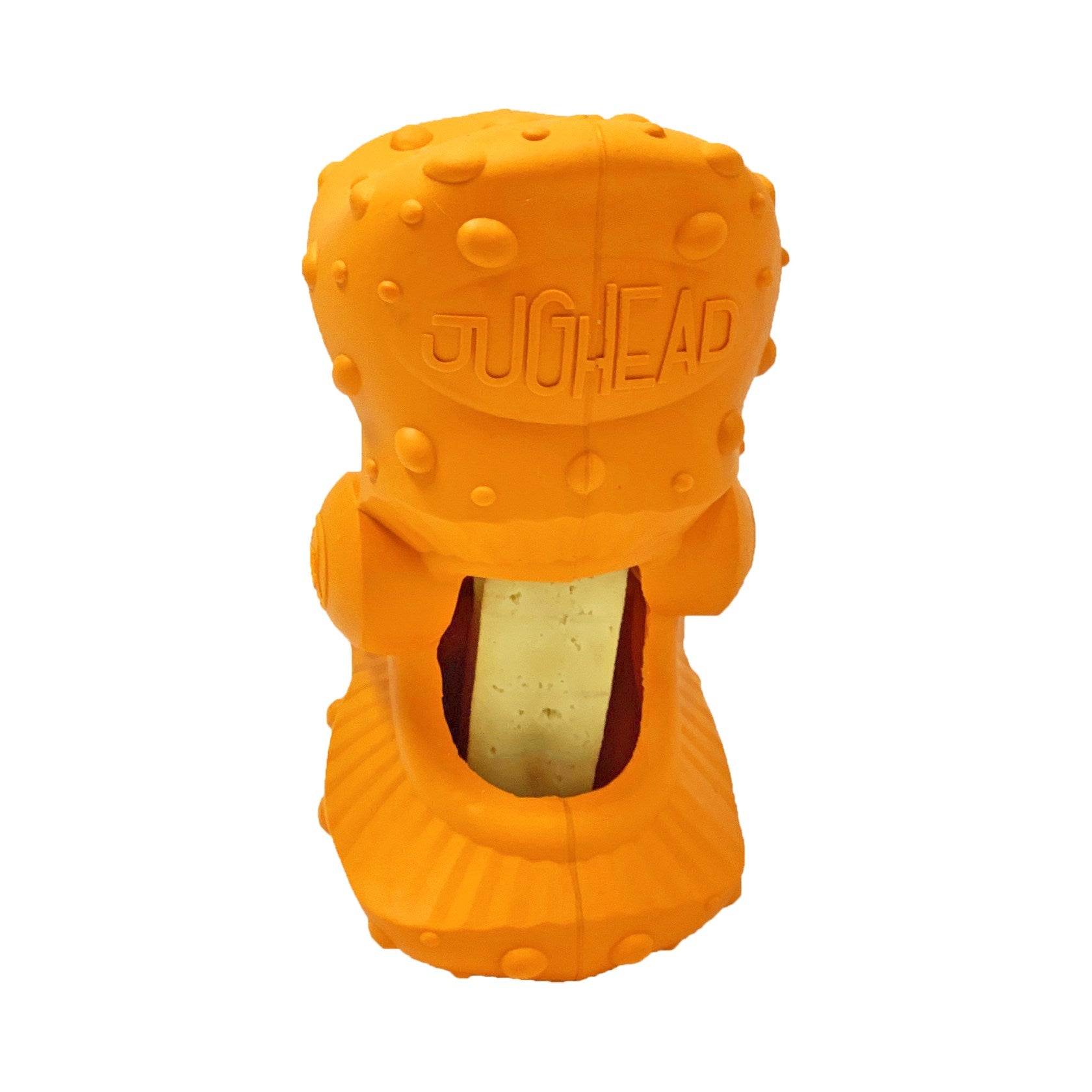Jughead® is a strong and durable toy that holds any type of chew to help extend the life of the chew; while giving your dog plenty of playtime entertainment. It is specifically designed to work with hard cheese chew inserts, but it can hold lots of other chews too, from bully sticks to celery. It’s easy to use, simply bend Jughead® in the center and slide the treat in to hold it in place. It’s now ready for your dog to enjoy and have fun.