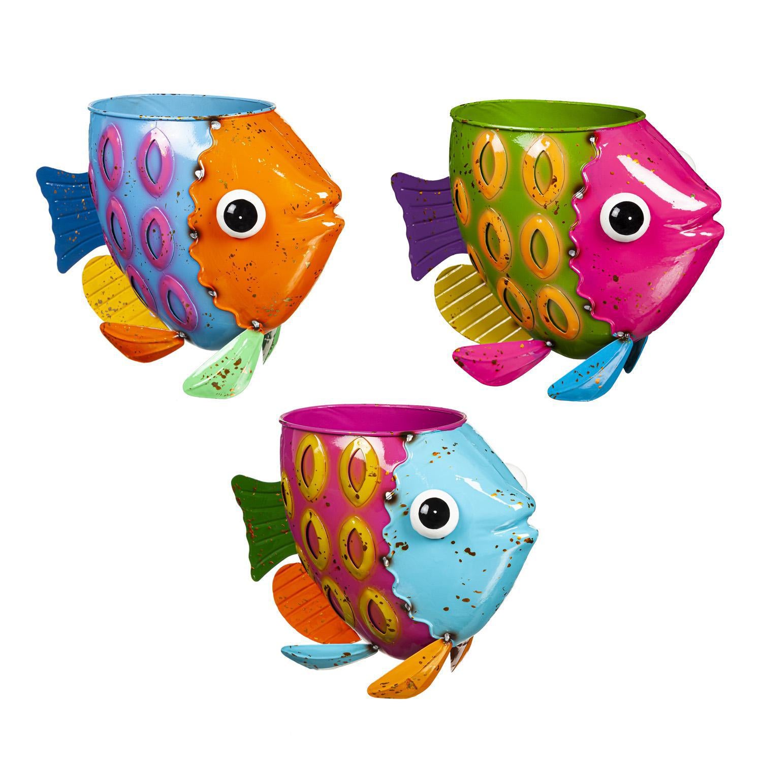 Take the tropics home and transform any space into a vibrant oasis with this set of three Tropical Fish Planters. The colorful trio boast vivid blue, pink, and green fins and scales with embossed details that add dimension. The splatter-like effect adds an extra dose of charm! Crafted of a weather-treated metal, these planters won't fade over time, ensuring the paints stay vibrant season after season. Ideal for holding flowers and leafy plants, place these finned friends along a path, in a garden, on a porch or patio, or anywhere indoors for an instant pick me up. No drainage holes.
