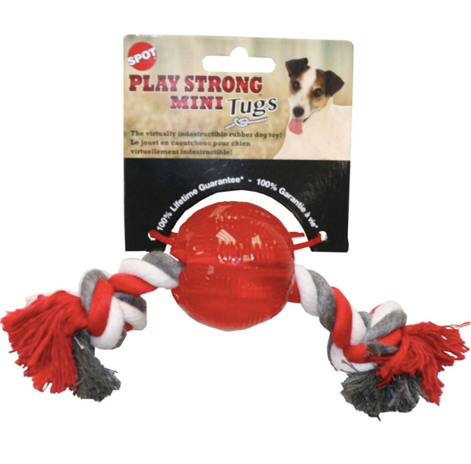 PLAY STRONG MINI BALLThe Play Strong Rubber Ball is a heavy weight toy that features a unique rubber/TPR formulation. A rope has been added through the center for added fun. Perfect for puppies and small dogs.