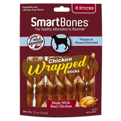 SmartBones® Chicken Wrapped Sticks Have All the Benefits of a Rawhide Chew – WITHOUT the RAWHIDE! NO RAWHIDE SmartBones® Chicken Wrapped chews are made with REAL CHICKEN and wholesome VEGETABLES, and have a delectable chicken layer wrapped around the outside, for a scrumptious taste dogs can’t resist.