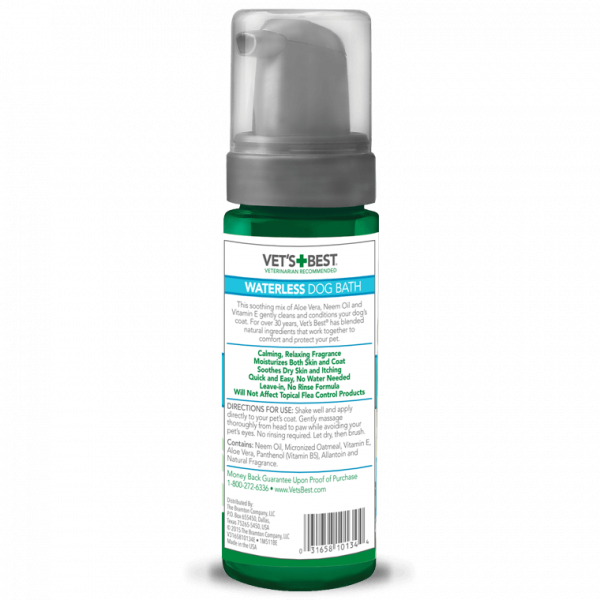 Vet's Best Waterless Dog Bath is a no-rinse foam dog shampoo that acts as a calming cleanser and moisturizer for your dog's skin and coat between baths. Waterless Dog shampoo is veterinarian formulated using natural ingredients (aloe vera and neem oil) and has a relaxing and calming fragrance. For use with dogs 12 weeks or older, and will not affect topical flea control products. The perfect solution when water is unavailable or in cold weather.
